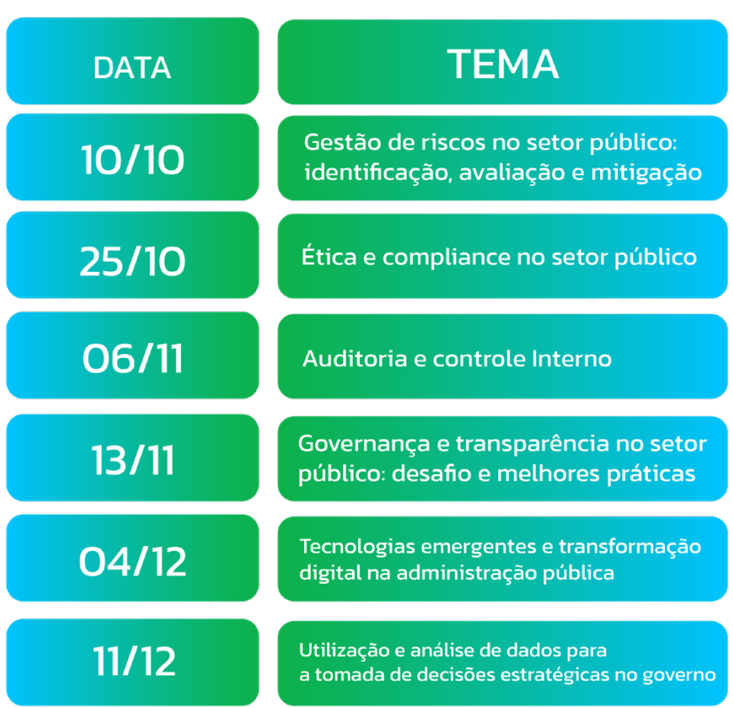 O primeiro encontro do Ciclo de Palestras aconteceu na tarde do dia 18 de setembro, com o tema “Inovação e Tecnologia na Gestão Pública”. A segunda palestra aconteceu na tarde do dia 25 de setembro, com o tema “Gestão Financeira e Orçamentária no Setor Público”, que reuniu servidores e terceirizados de órgãos das esferas municipal, estadual e federal.