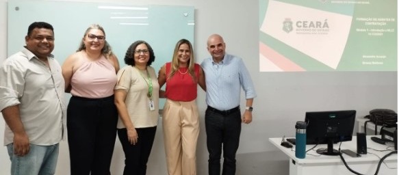 Da esquerda para a Direita: O instrutor da formação, Ernany Henrique, a articuladora da Coped da EGPCE, Carolina Tahim, a coordenadora da Coped da EGPE, Josy Coelho, a coordenadora geral da Central de Licitações da PGE, Valéria de Oliveira Rodrigues e o instrutor da formação, Alexandre Arcanjo.
