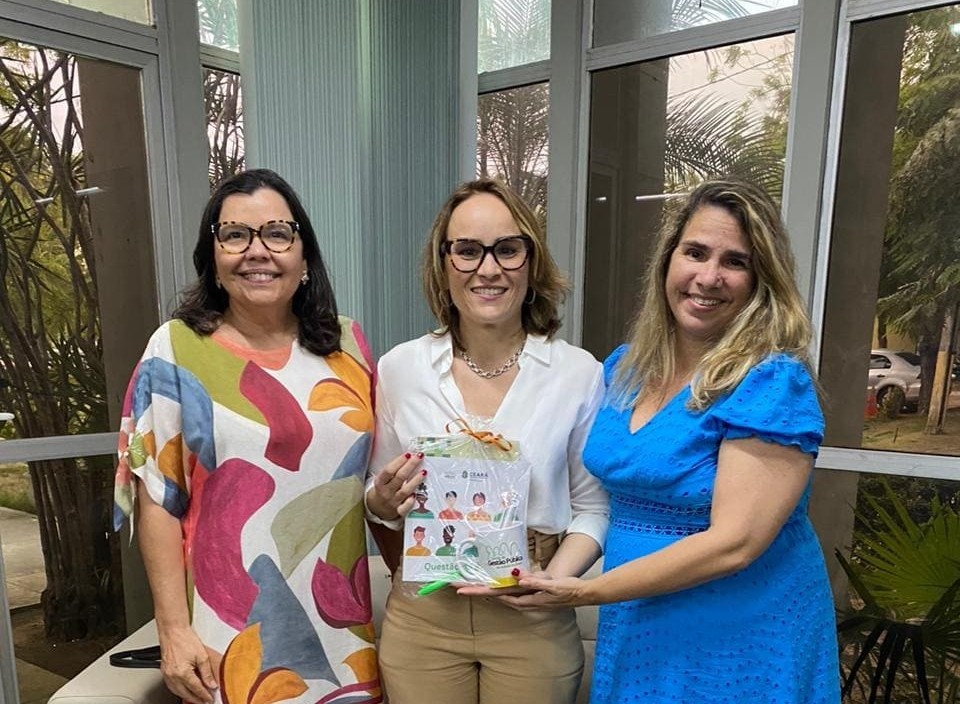 Secretária do Planejamento e Gestão, Sandra Machado, e diretora da EGPCE, Dulce Ane Lucena, entregam Cartilha de Ética para a presidente do FNDE, Fernanda Pacobahyba