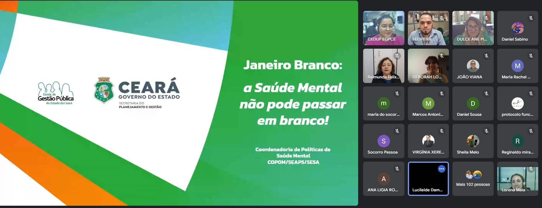 A Escola de Gestão Pública do Estado do Ceará iniciou, na tarde de 30 de janeiro, a Jornada do Bem-Estar no Trabalho com a palestra sobre Saúde Mental, em alusão ao Janeiro Branco, mês de conscientização da saúde mental e emocional. O evento “Janeiro Branco - A saúde mental não pode passar em branco” foi ministrado pela coordenadora da Política Estadual de Saúde Mental da Secretaria de Saúde do Estado do Ceará, Rane Félix.