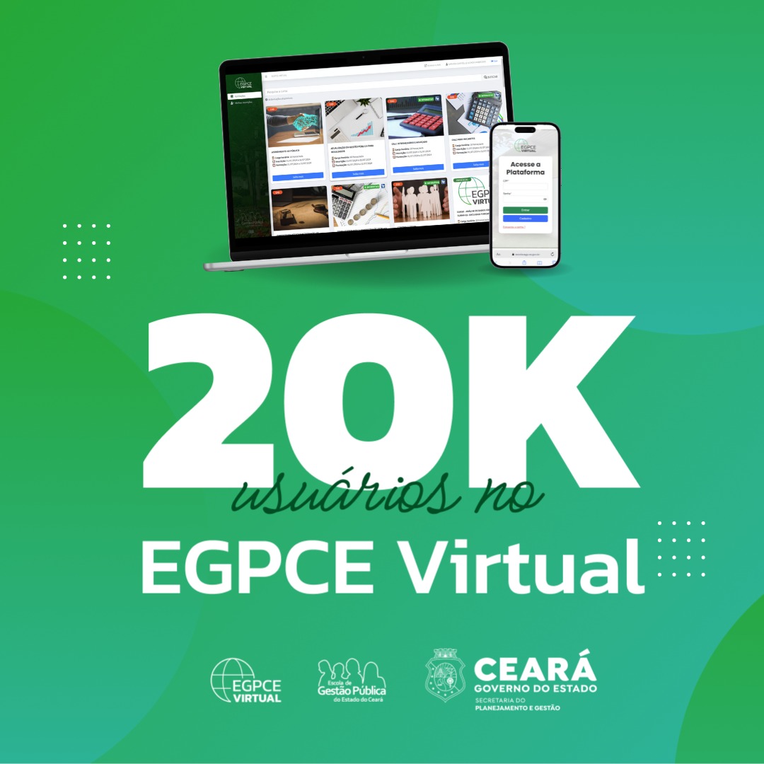 Chegamos à marca de 20 mil usuários cadastrados na nossa plataforma “EGPCE Virtual”! O sistema é um ambiente que hospeda nossos cursos e eventos formativos, com o objetivo de proporcionar educação de qualidade a servidores públicos e a sociedade civil do Ceará. Trabalhamos diariamente para melhorar nossos serviços, garantindo uma experiência de aprendizagem eficiente e enriquecedora.