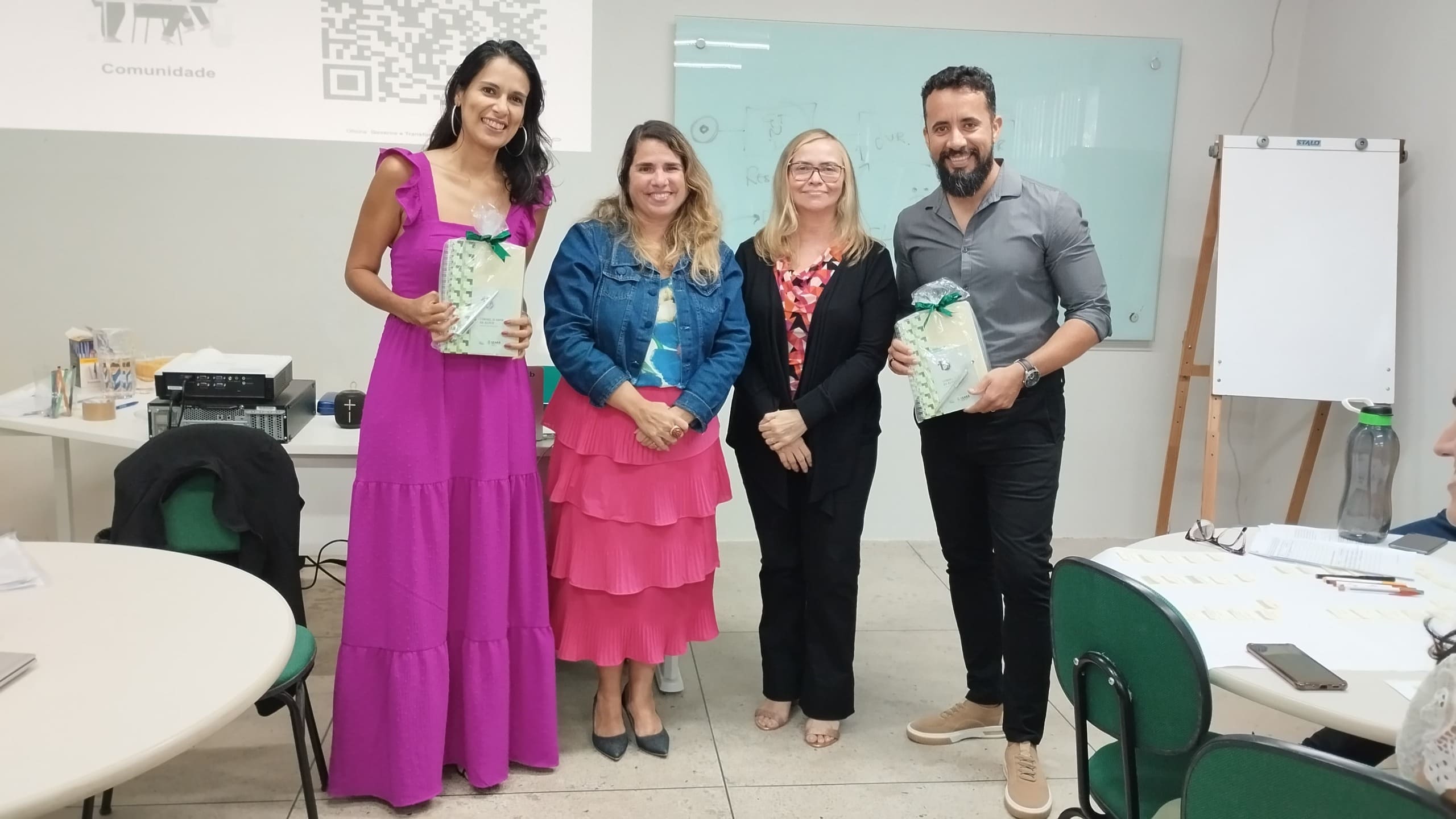 A diretora da EGPCE, Dulce Ane, e a orientadora de célula da Coped, Dorenice Fernandes, entregam material institucional da Escola para os profissionais da Enap, Anderson Costa e Mariana Almeida.