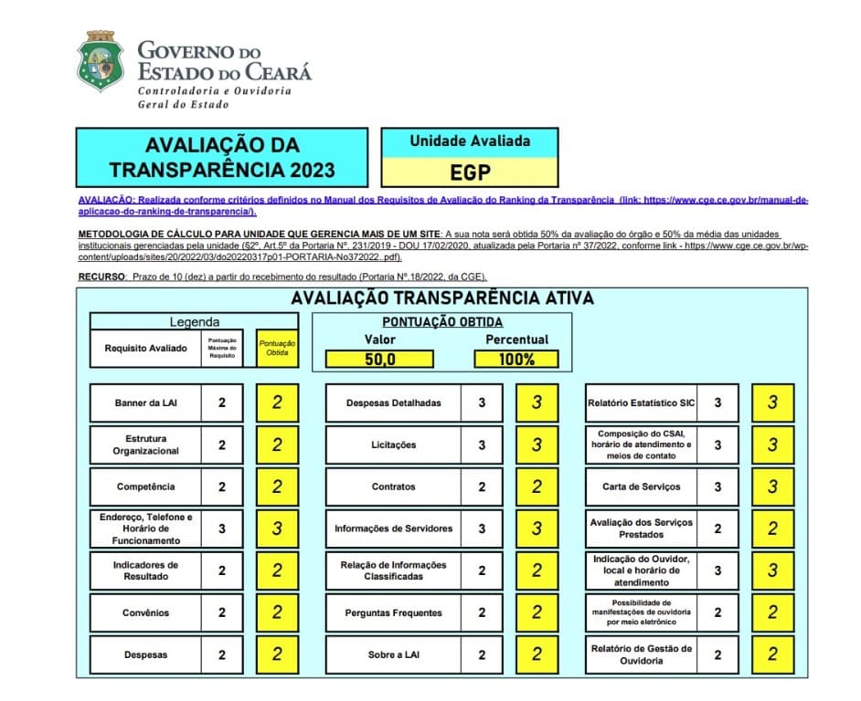 A EGPCE alcançou a pontuação máxima na Avaliação da Transparência de 2023, no ranking obtido pela nota da transparência ativa e passiva do órgão/entidade.