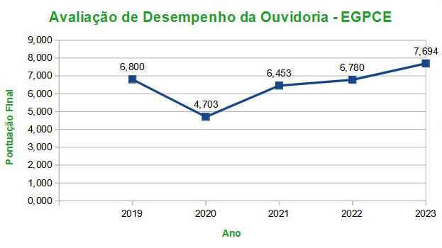A Escola de Gestão Pública do Estado do Ceará apresentou notas máximas em alguns critérios de desempenho no Relatório Final de Avaliação de Desempenho das Ouvidorias - 2023. Os requisitos com pontuações mais elevadas foram “Satisfação do Cidadão”, “Relatório de Ouvidoria” e “Identificação Visual e Divulgação de Contatos”. Nos últimos 3 anos, a Escola vem alcançando índices de crescimento contínuo, obtendo em 2023 um resultado de 0,914 pontos a mais do que no ano anterior.
