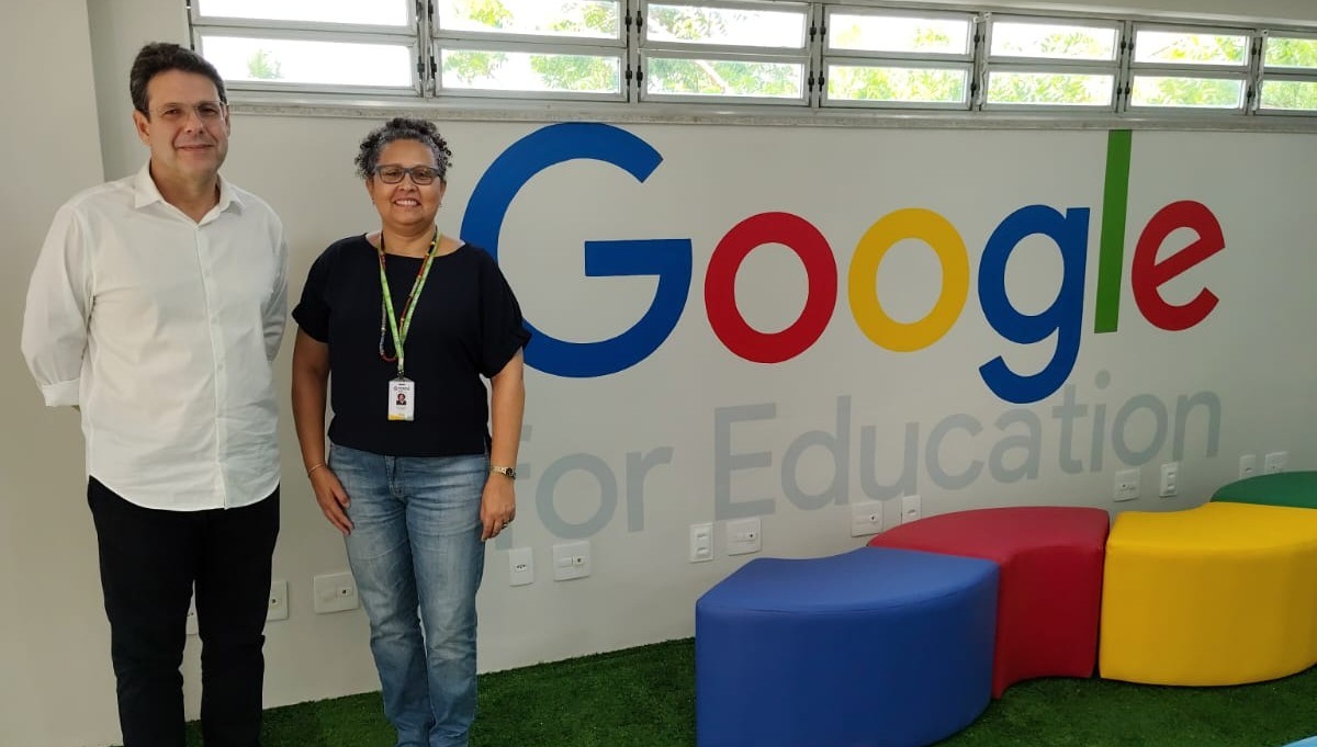 O diretor da EGPCE, Carlos Eduardo Marino, e a coordenadora pedagógica Josinelde Coelho, na inauguração da sala Google