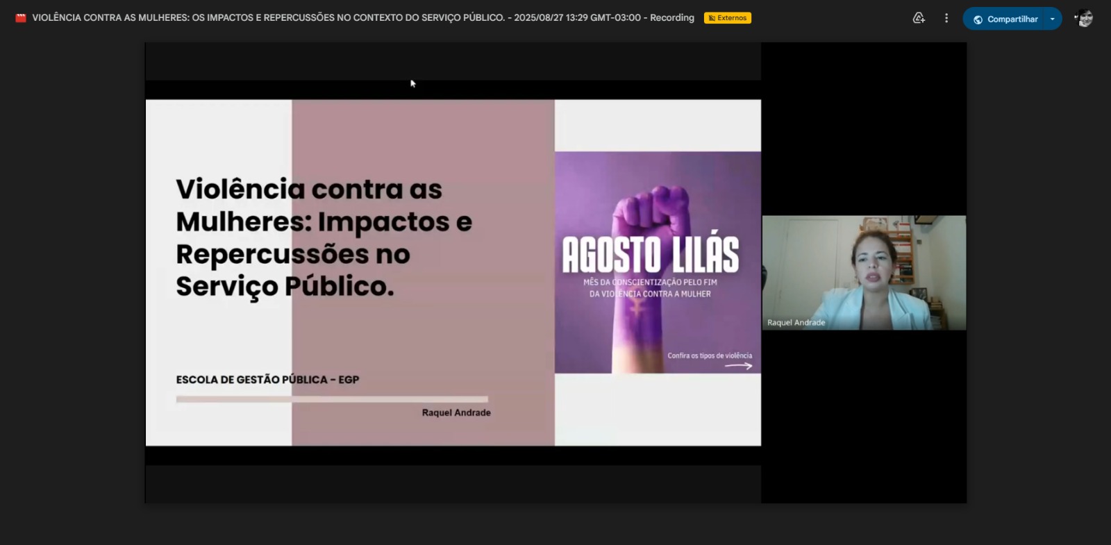 O objetivo foi orientar servidores(as) públicos(as) para compreender, identificar e agir diante dos impactos da violência contra as mulheres no ambiente e na produtividade do serviço público, promovendo um ambiente institucional seguro, inclusivo e com perspectiva de gênero. A palestra de 2h/a foi ministrada pela secretária executiva de Direitos Humanos do Estado do Ceará, Raquel Andrade dos Santos.