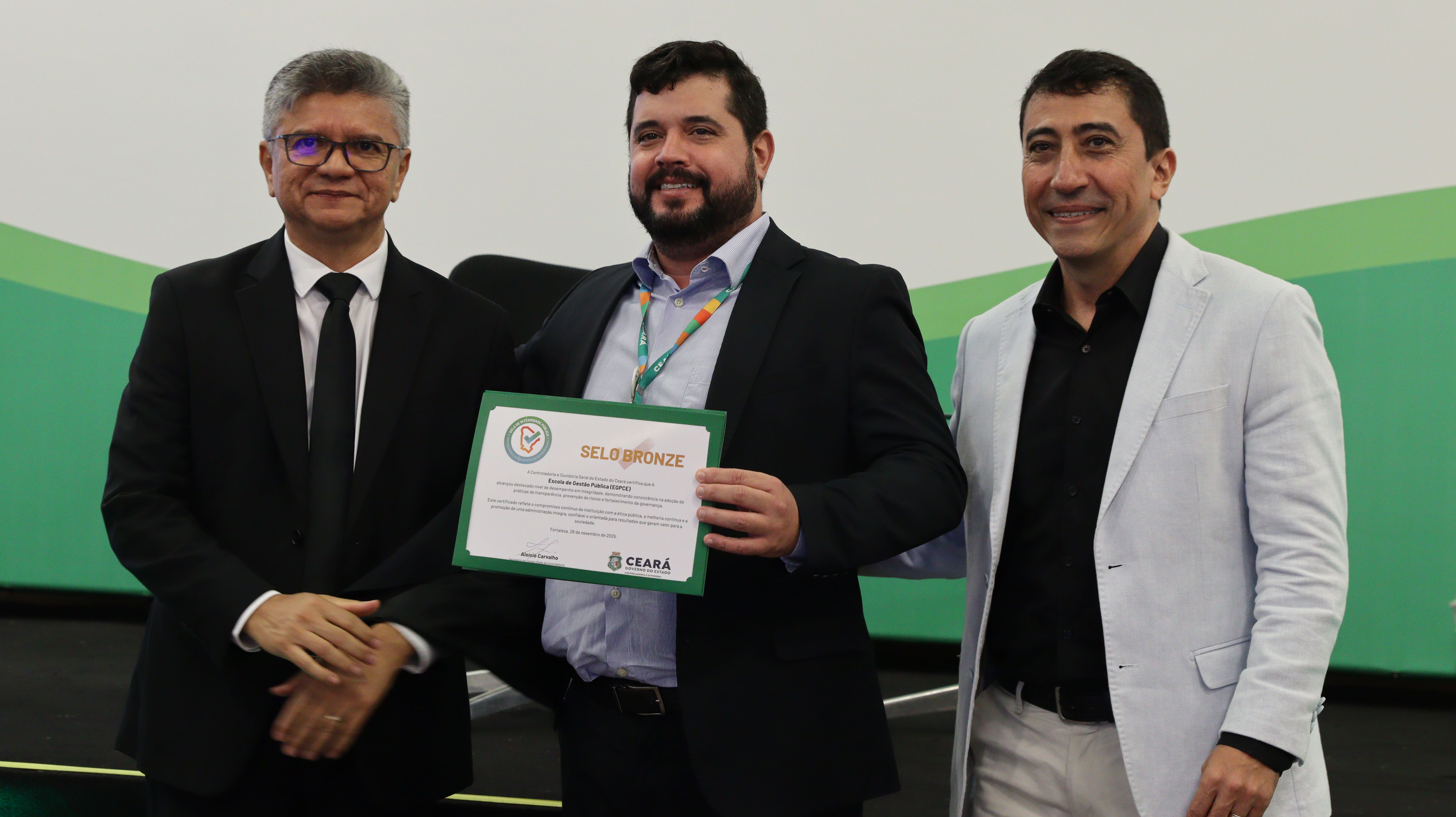 Saulo recebe o certificado das mãos do secretário executivo da Controladoria e Ouvidoria Geral do Estado (CGE) , Antonio Marconi Lemos, e do auditor de Controle Interno da CGE, Ítalo Brígido