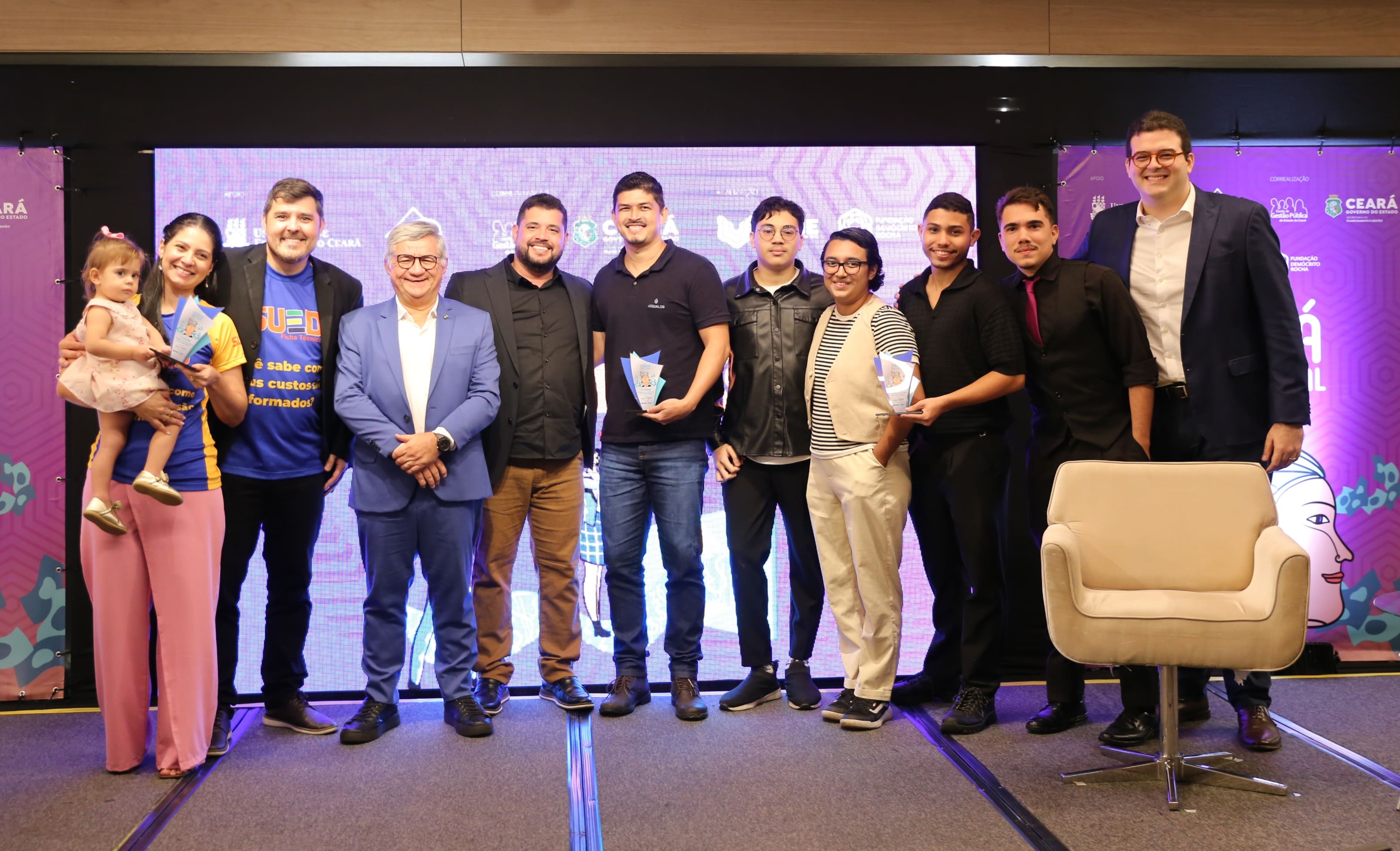 Diretor Saulo Braga e secretário Alexandre Cialdini com equipes das startups ganhadoras no encerramento do programa Ceará Mais Digital