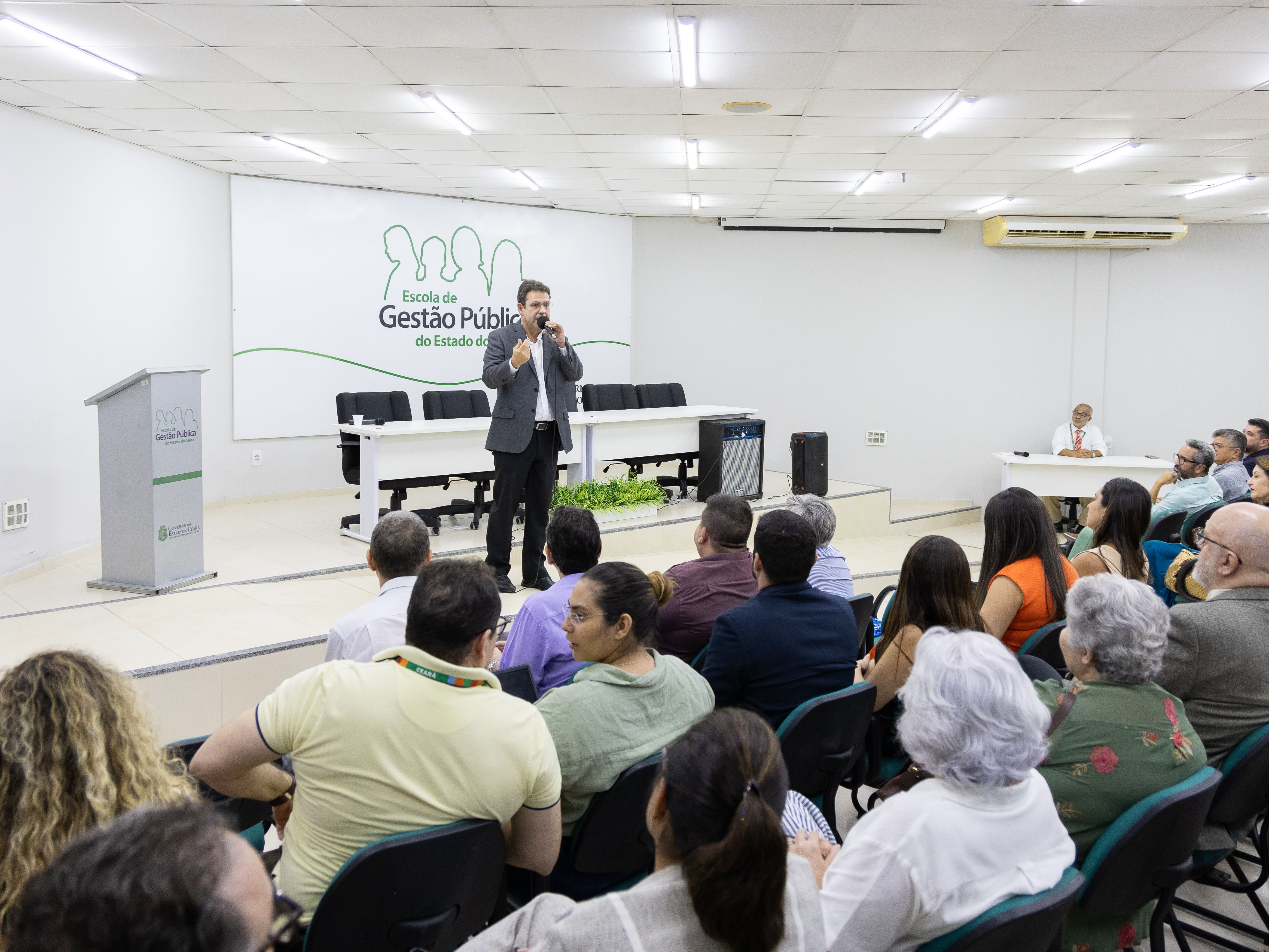 Secretário da Seplag, Alexandre Cialdini, discursa na solenidade de posse do novo diretor da EGPCE.