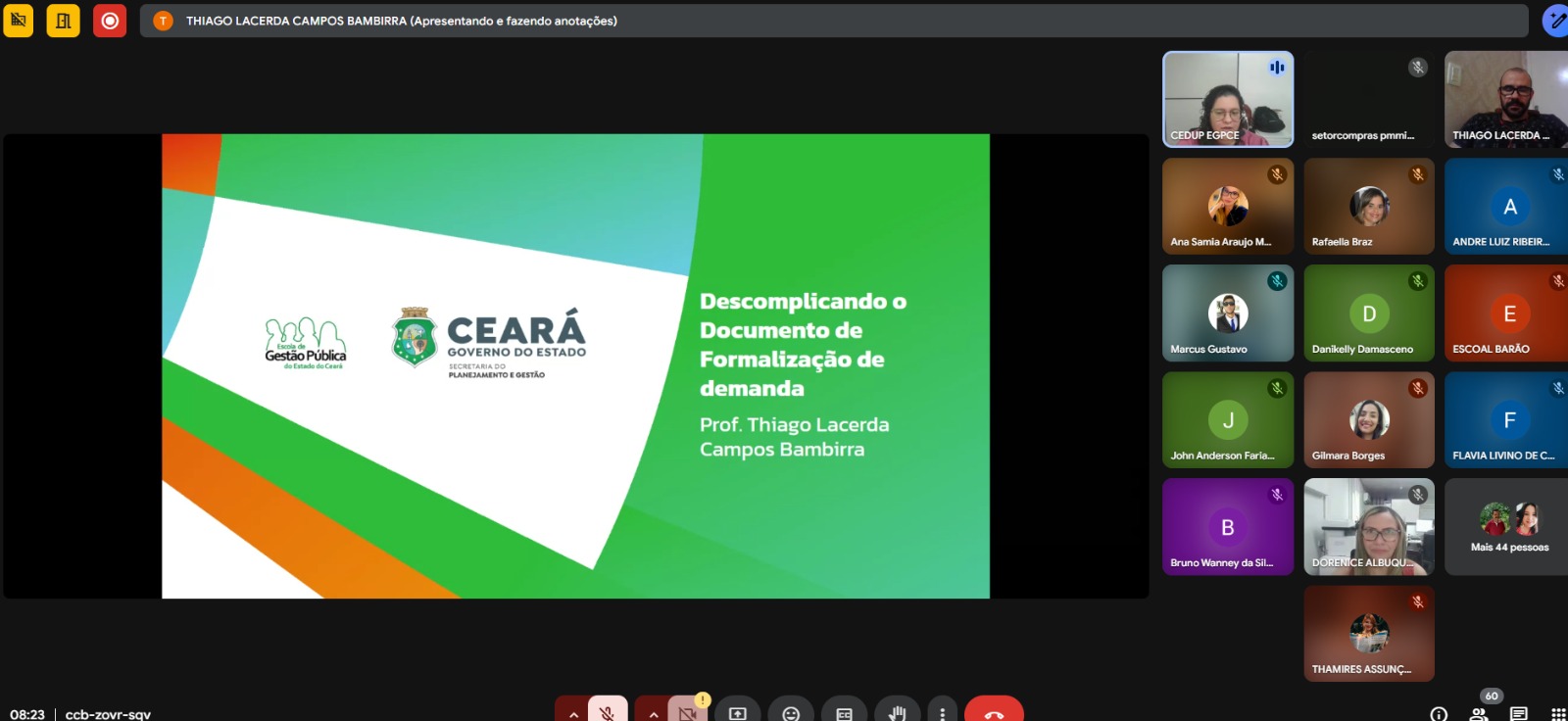 A Escola de Gestão Pública do Estado do Ceará, na manhã de 13 de junho, finalizou o seminário online “Descomplicando o Documento de Formalização da Demanda à Luz da Lei Nº 14.133/2021 e da Regulamentação Estadual do Ceará”, ministrado pelo auditor fiscal da Sefaz, Thiago Lacerda Bambirra.
