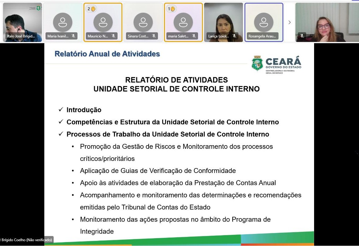 Na tarde de 28 de maio, a assessoria de Controle Interno da Escola de Gestão Pública do Estado do Ceará participou do II Encontro de Integração do Sistema de Controle Interno, promovido pela Controladoria e Ouvidoria Geral do Estado do Ceará (CGE). Na ocasião, foram abordados o Planejamento Anual e o Relatório Anual de Atividades da Unidade Setorial de Controle Interno.