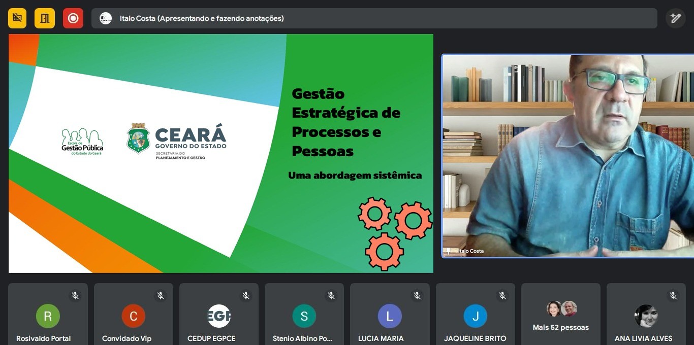 No dia 20 de março, a Escola de Gestão Pública promoveu a palestra online “Gestão Estratégica de Processos e Pessoas”, no Ambiente Virtual da EGPCE.