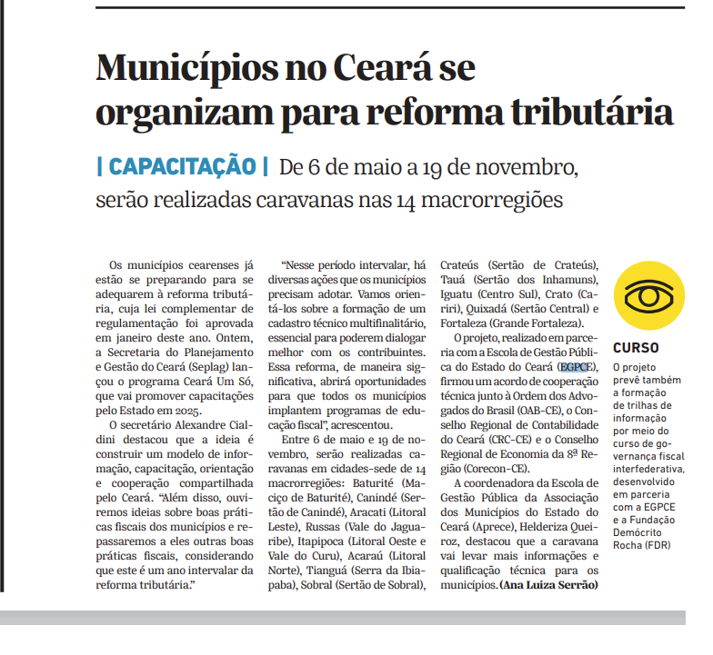 A Escola de Gestão Pública do Estado do Ceará (EGPCE) tem se destacado cada vez mais na imprensa como instituição de ensino comprometida com o desenvolvimento da gestão pública. No mês de março, iniciativas como o curso EaD voltado para medidas socioeducativas, a formação híbrida para a Defesa Civil Municipal, além do lançamento das Caravanas Ceará Um Só ganharam destaque em portais de notícias, blogs e na TV.