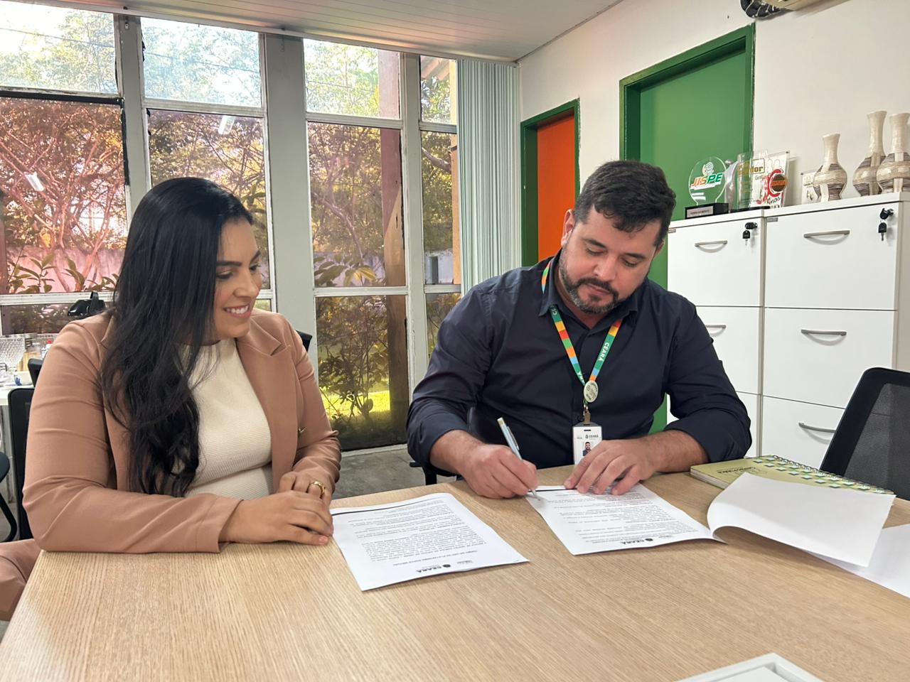 Controladora-geral de Guaraciaba do Norte, Eva Mágila de Oliveira, e o diretor da EGPCE, Saulo Braga, formalizam a assinatura do termo de cooperação técnica