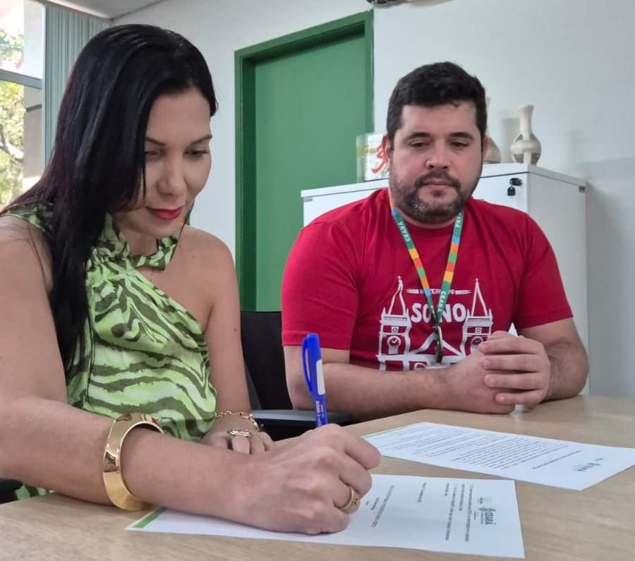 O diretor da EGPCE, Saulo Braga, formaliza a entrega do Ambiente Virtual de Aprendizagem (AVA) à diretora da EGP Crato, Larissa Cavalcante.