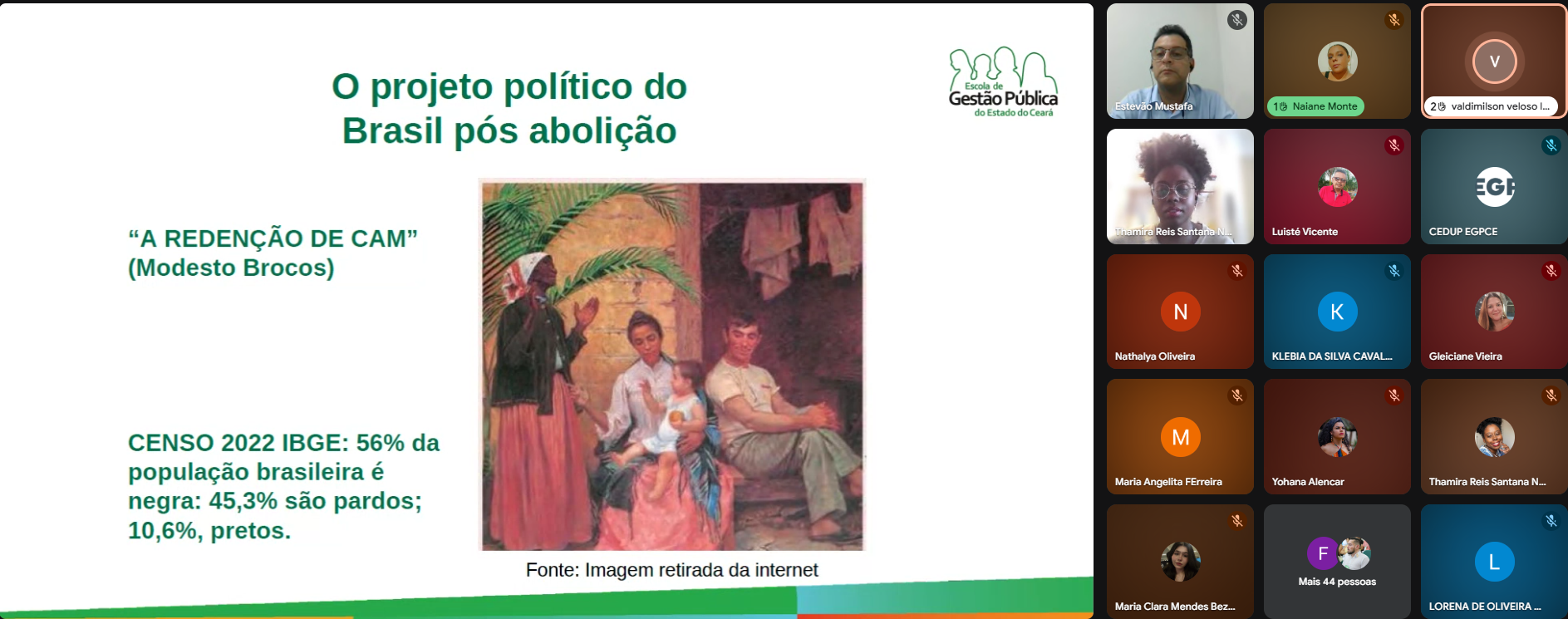A Escola de Gestão Pública do Estado do Ceará (EGPCE) realizou, juntamente com a Secretaria da Igualdade Racial, a oficina virtual “Políticas Públicas de Igualdade Racial - Formação para Agentes Públicos no Âmbito do Selo Município Sem Racismo”, de 30 de setembro a 3 de outubro, no ambiente virtual da EGPCE.